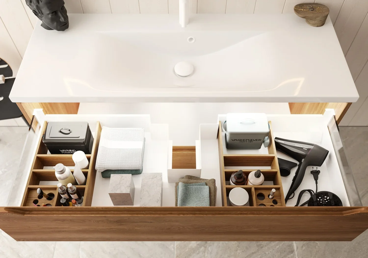 Velg mellom stikkontakt i skuff, lys i skuff, matter som held ting på plass -du finn det du treng for å halde orden på badet ditt.